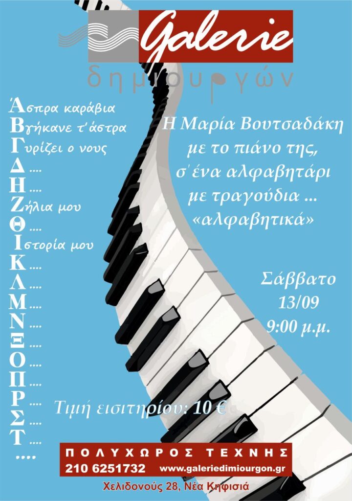 Το Σάββατο 13/9/25 Η Μαρία Βουτσαδάκη μας καλεί να ξεφυλλίσουμε μαζί της ένα αλφαβητάρι από τραγούδια.