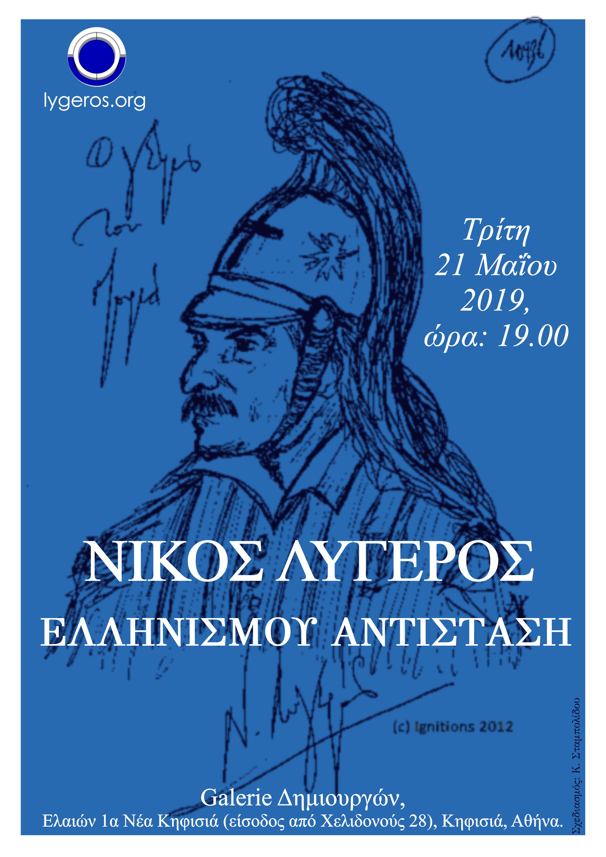 Διάλεξη του Ν. Λυγερού με θέμα: “Ελληνισμού Αντίσταση”. Galerie Δημιουργών, Ελαιών 1α Νέα Κηφισιά (είσοδος από Χελιδονούς 28), Κηφισιά, Αθήνα. Τρίτη 21 Μαΐου 2019, ώρα: 19.00