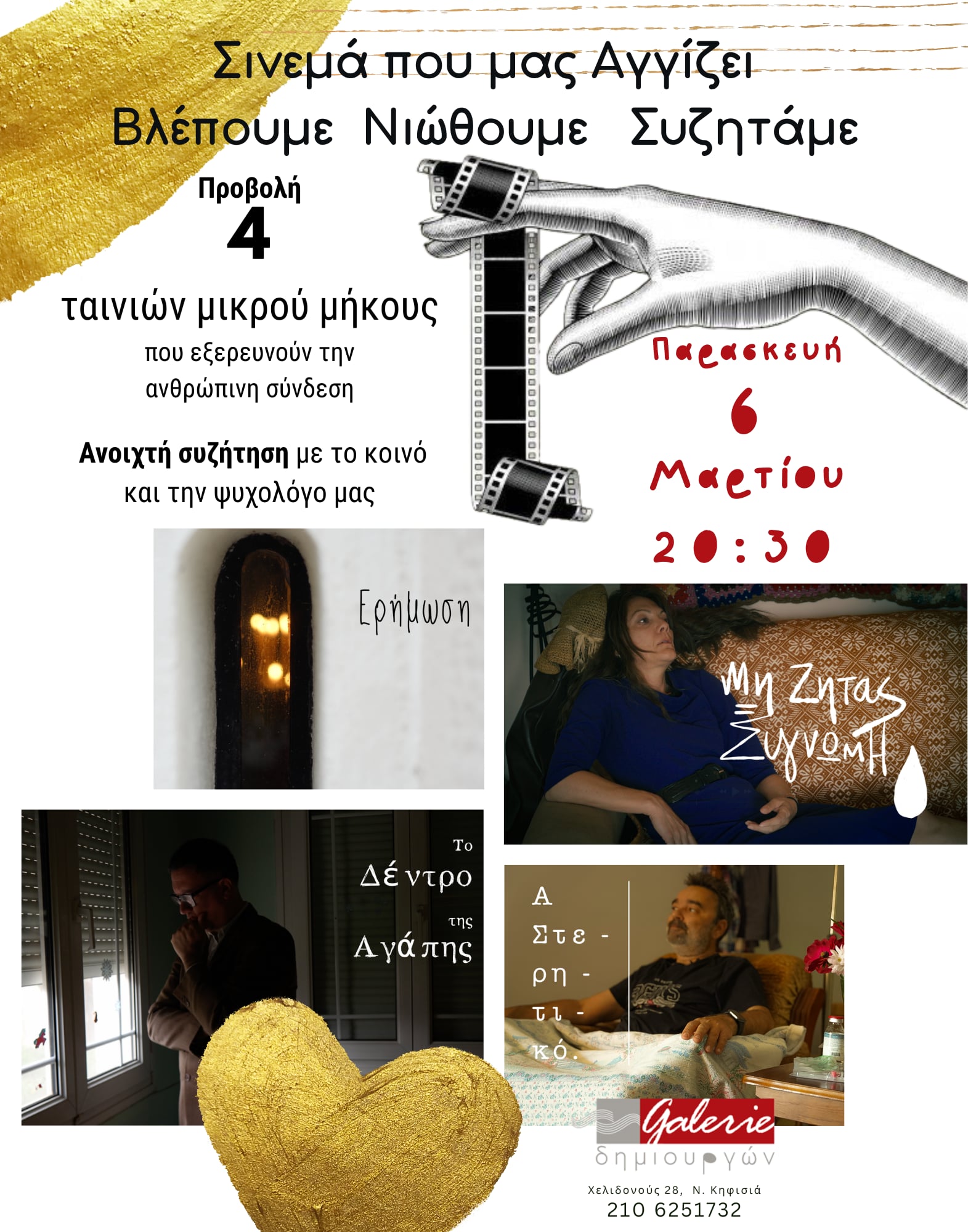 Θα ακολουθήσει συζήτηση με την ψυχολόγο Νινέττα Δυοβουνιώτου Την Παρασκευή 6 Μαρτίου στην Galerie Δημιουργών στην Κηφισιά στις 8:30 το βράδυ