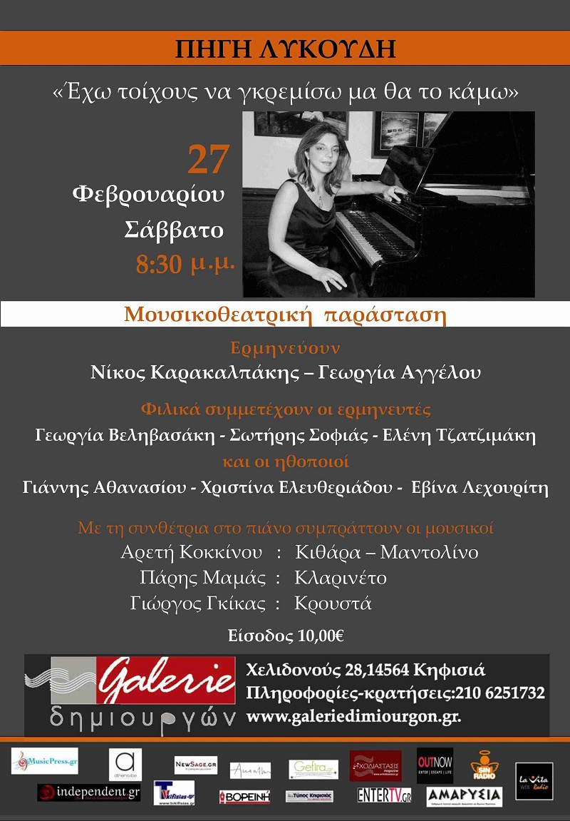Μετά την εξαιρετική επιτυχία της πρώτης παρουσίασης των πιο αγαπημένων τραγουδιών της μέχρι σήμερα πορείας της, η συνθέτις Πηγή Λυκούδη, με προτροπή όσων δεν πρόλαβαν να συμμετέχουν στην ξεχωριστή αυτή βραδιά της Galerie δημιουργών το προηγούμενο Δεκέμβριο, παρουσιάζει ακόμη μία φορά συνθέσεις της σε ποιήματα που συνέλεξε από τους ολάνθιστους ποιητικούς κήπους των Γιάννη Ρίτσoυ, Νικηφόρου Βρεττάκου, Γιωσέφ Ελιγιά, Γεωργίου Σουρή, Ζαχαρία Παπαντωνίου, Μυρτιώτισσας, Λευτέρη Παπαδόπουλου, Μιχάλη Γκανά, Μιχάλη Μπουρμπούλη μαζί με τους στίχους των Νάνσυ Κανέλλη, Ξένιας Δικαίου, Γιάννη Π. Ιωαννίδη, Θανάση Σάλτα, Γιάννη Παπάνη, Σταυρούλας Γάτσου και Γιώργου Αλεξάνδρου. Ξεχωριστή θέση έχουν τα τραγούδια από το νέο cd της «ΕΝ ΟΝΟΜΑΤΙ ΤΟΥ ΧΡΟΝΟΥ» σε στίχους Φίλιππου Γράψα.