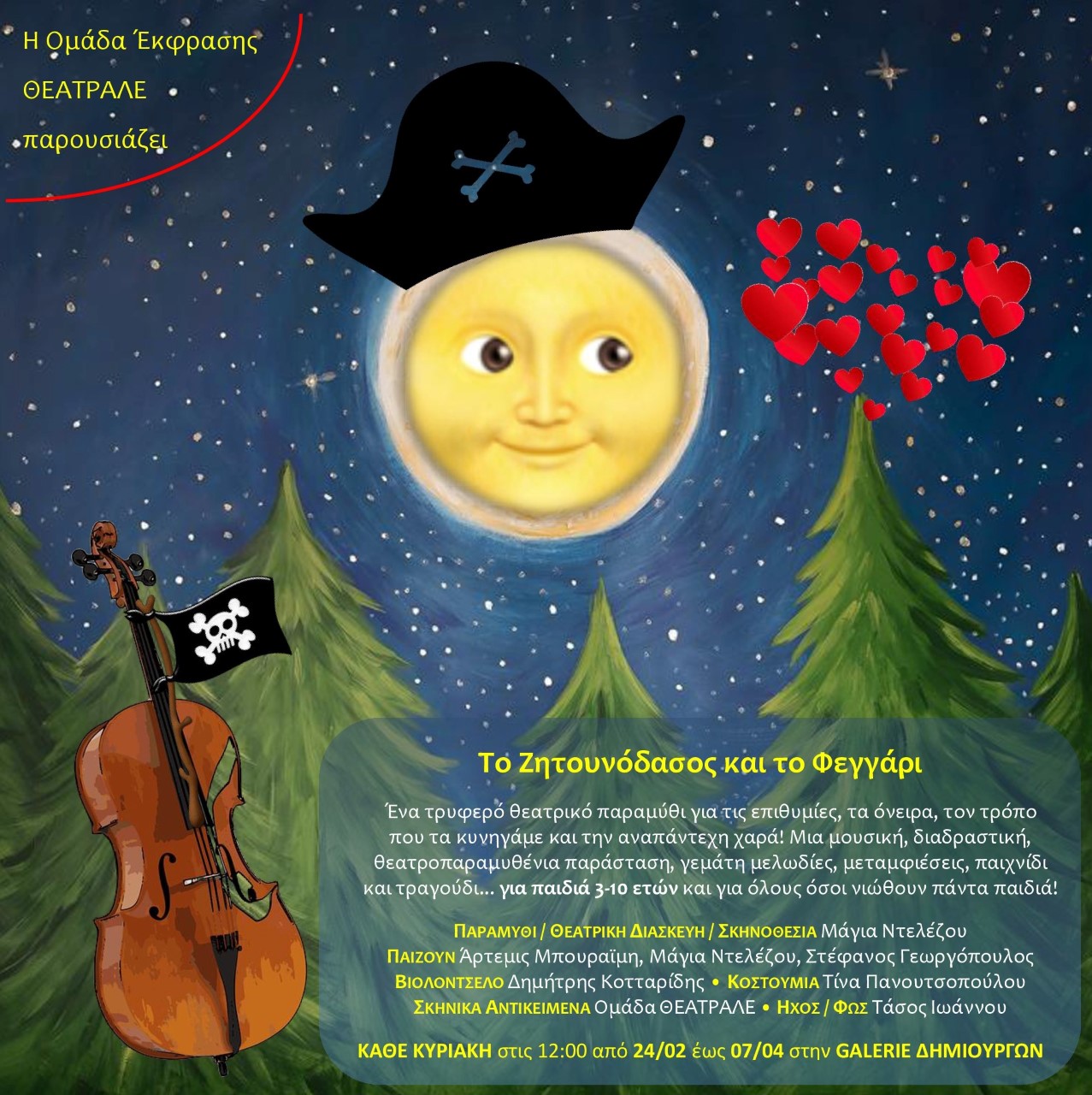 Η Ομάδα Έκφρασης Θεατράλε παρουσιάζει στον Πολυχώρο Τέχνης Galerie Δημιουργών και σε ανοιξιάτικη περιοδεία, την ολοκαίνουρια, διαδραστική (και άκρως διασκεδαστική!) θεατροπαραμυθένια παράσταση «Το Ζητουνόδασος και το Φεγγάρι»… Ένα μουσικό, αφηγηματικό-θεατρικό παραμύθι, γεμάτο μοναδικές μελωδίες, μεταμφιέσεις, παιχνίδι και τραγούδι, για παιδιά 3-10 ετών και για όλους όσοι νιώθουν πάντα παιδιά!
