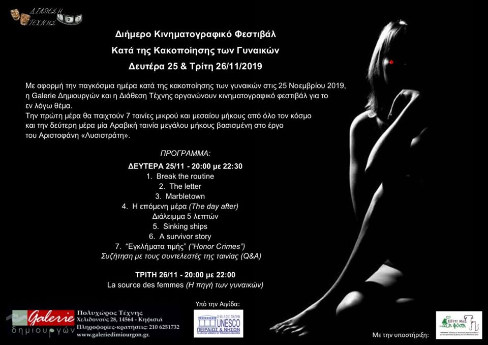 Με αφορμή την παγκόσμια ημέρα κατά της κακοποίησης των γυναικών στις 25 Νοεμβρίου 2019, η Galerie Δημιουργών και η Διάθεση Τέχνης οργανώνουν κινηματογραφικό φεστιβάλ για το εν λόγω θέμα. Την πρώτη μέρα θα παιχτούν 7 ταινίες μικρού και μεσαίου μήκους από όλο τον κόσμο και την δεύτερη μέρα μία μεγάλου μήκους Αραβική ταινία βασισμένη στο έργο του Αριστοφάνη, Λυσιστράτη.