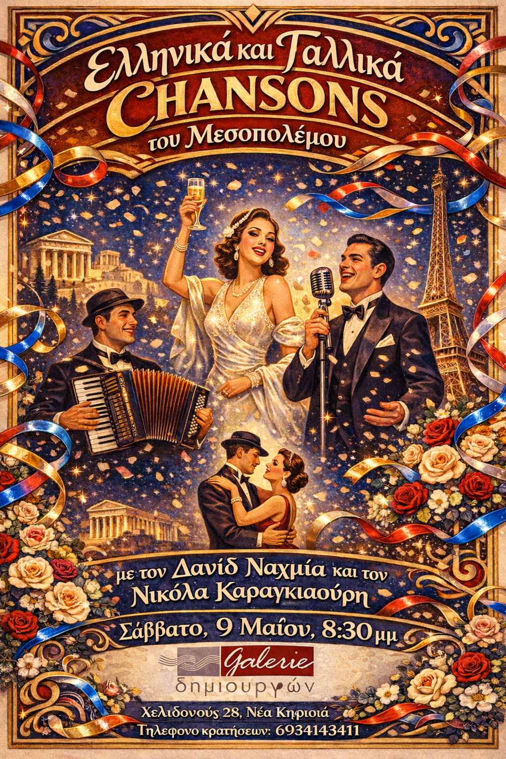 Το Σάββατο 9 Μαΐου, στις 20:30, η Galerie Δημιουργών στη Νέα Κηφισιά ανοίγει τις πόρτες της σε μια βραδιά υψηλής αισθητικής και πολιτιστικής μνήμης, όπου η Αθήνα και το Παρίσι του 1930 συναντιούνται ξανά, μέσα από μελωδίες που σφράγισαν μια ολόκληρη εποχή.