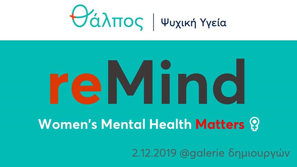 Η Μονάδα Ψυχοκοινωνικής Αποκατάστασης «Θάλπος Αττικής», στο πλαίσιο των ετήσιων δράσεων της για την Ψυχική Υγεία, πραγματοποιεί την εκδήλωση «reMind – Women’s Mental Health Matters ♀», τη Δευτέρα 2 Δεκεμβρίου 2019 & ώρα 18:00 – 21:00 στον πολυχώρο «Galerie Δημιουργών».